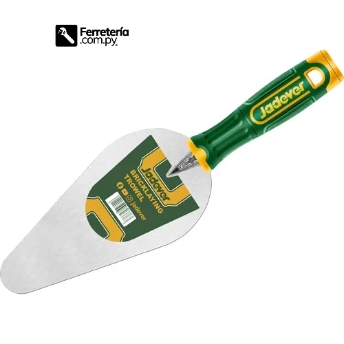 Cuchara de albañil JADEVER, diseñada para trabajos de construcción, mezcla y aplicación de cemento o argamasa. Fabricada en acero al carbono resistente con mango ergonómico para un agarre cómodo y preciso