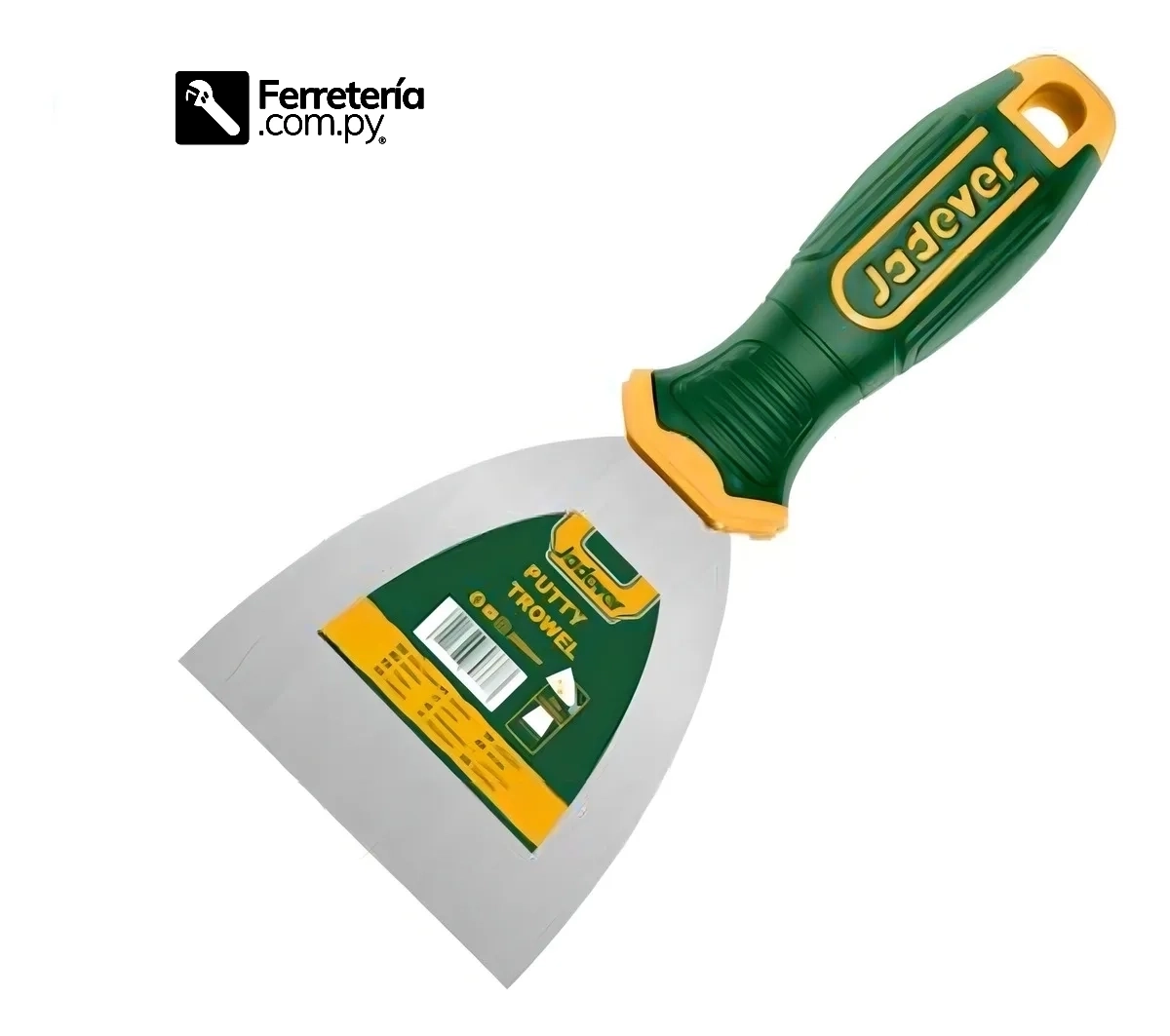 Espátula metálica JADEVER, ideal para aplicar, extender o raspar masillas, pinturas o adhesivos. Fabricada en acero resistente con mango ergonómico para un agarre firme y cómodo durante el trabajo.