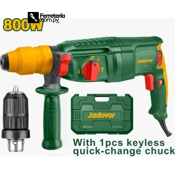 El Rotomartillo Eléctrico JADEVER JDRH1D26 es la herramienta perfecta para perforar concreto, acero o madera con eficiencia y potencia profesional. Con 800W de potencia, energía de impacto de 2.5J y sistema SDS Plus