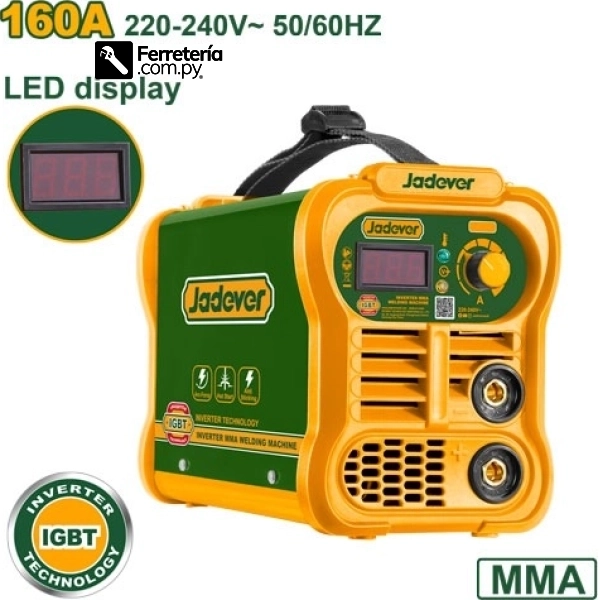 El soldador inverter de JADEVER, es ideal para tus trabajos en herrería. Sus características principales incluyen un voltaje de entrada de 220-240V, frecuencia de 50/60Hz y una corriente de salida que varía de 10 a 160A. Tiene una pantalla LED y es adecuada para electrodos con un diámetro de 1,6 a 3,2 mm.